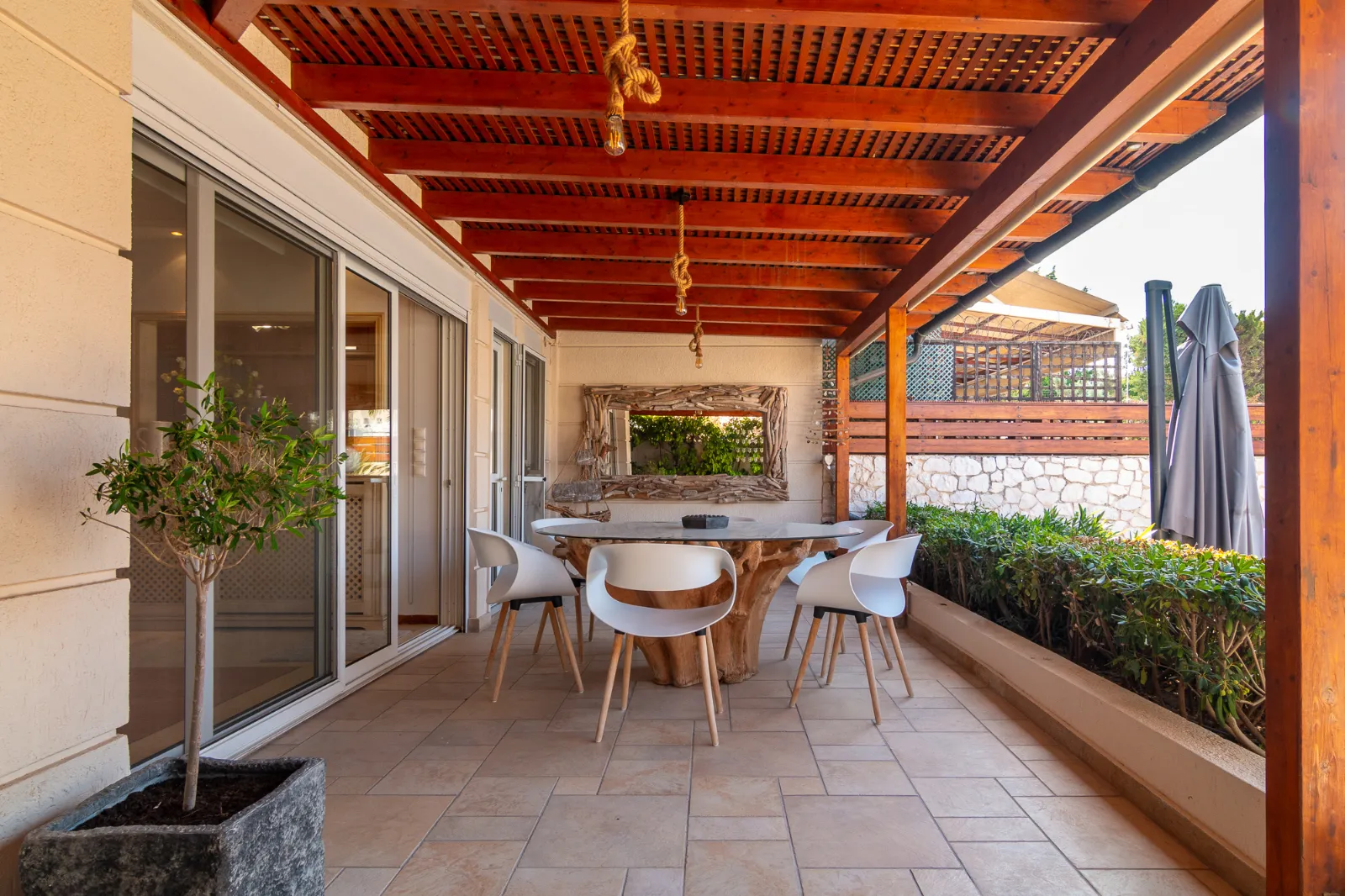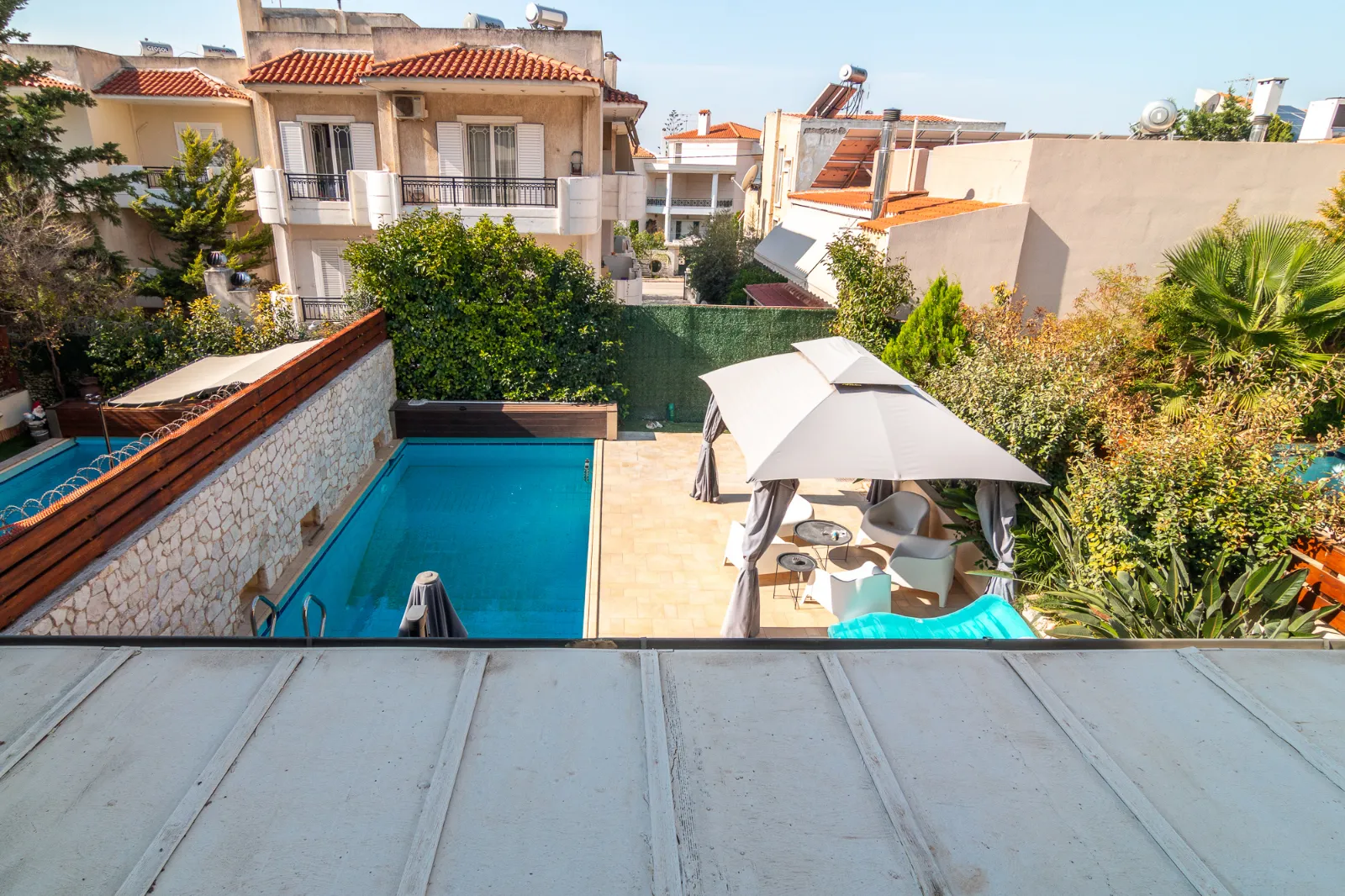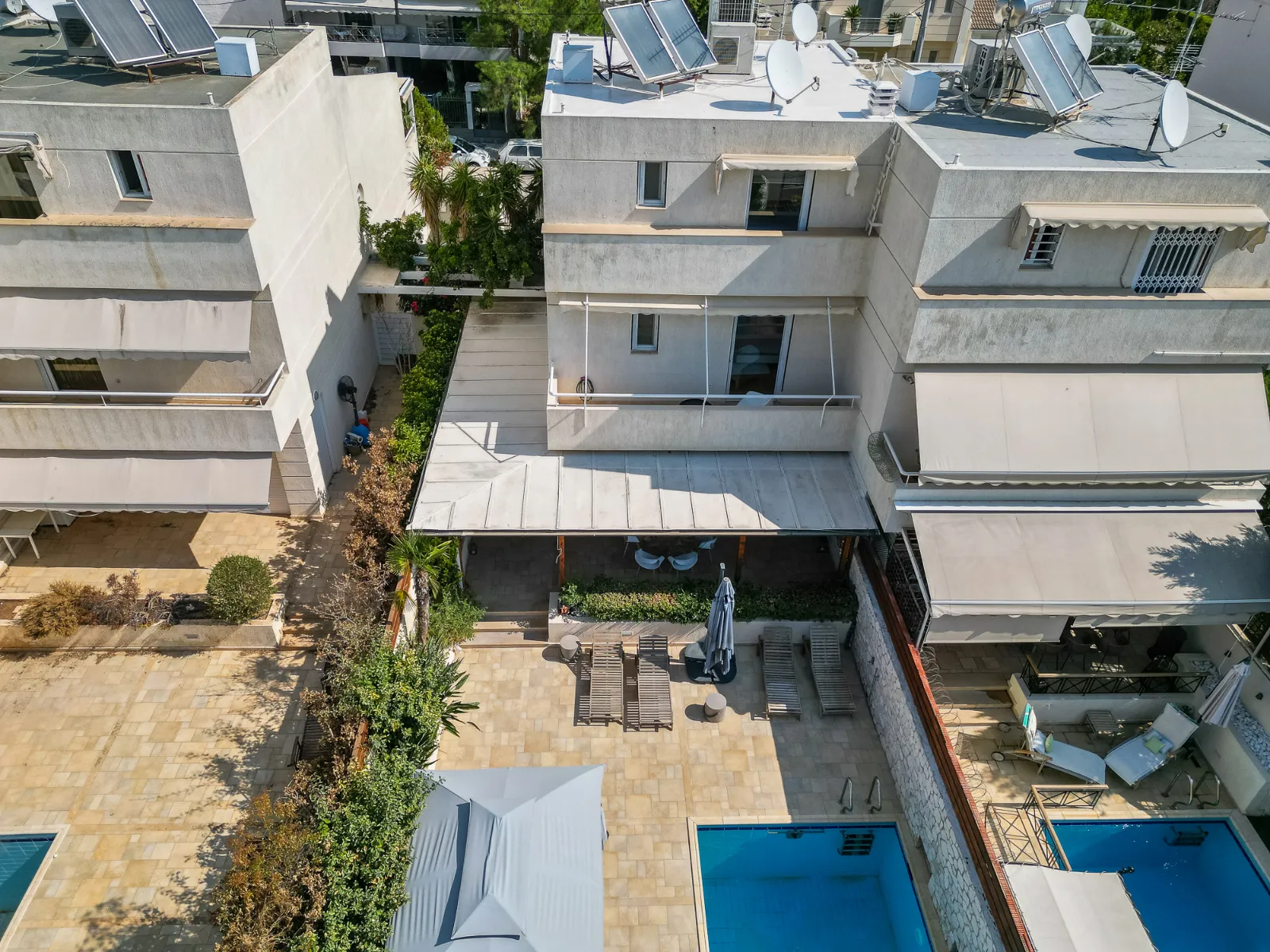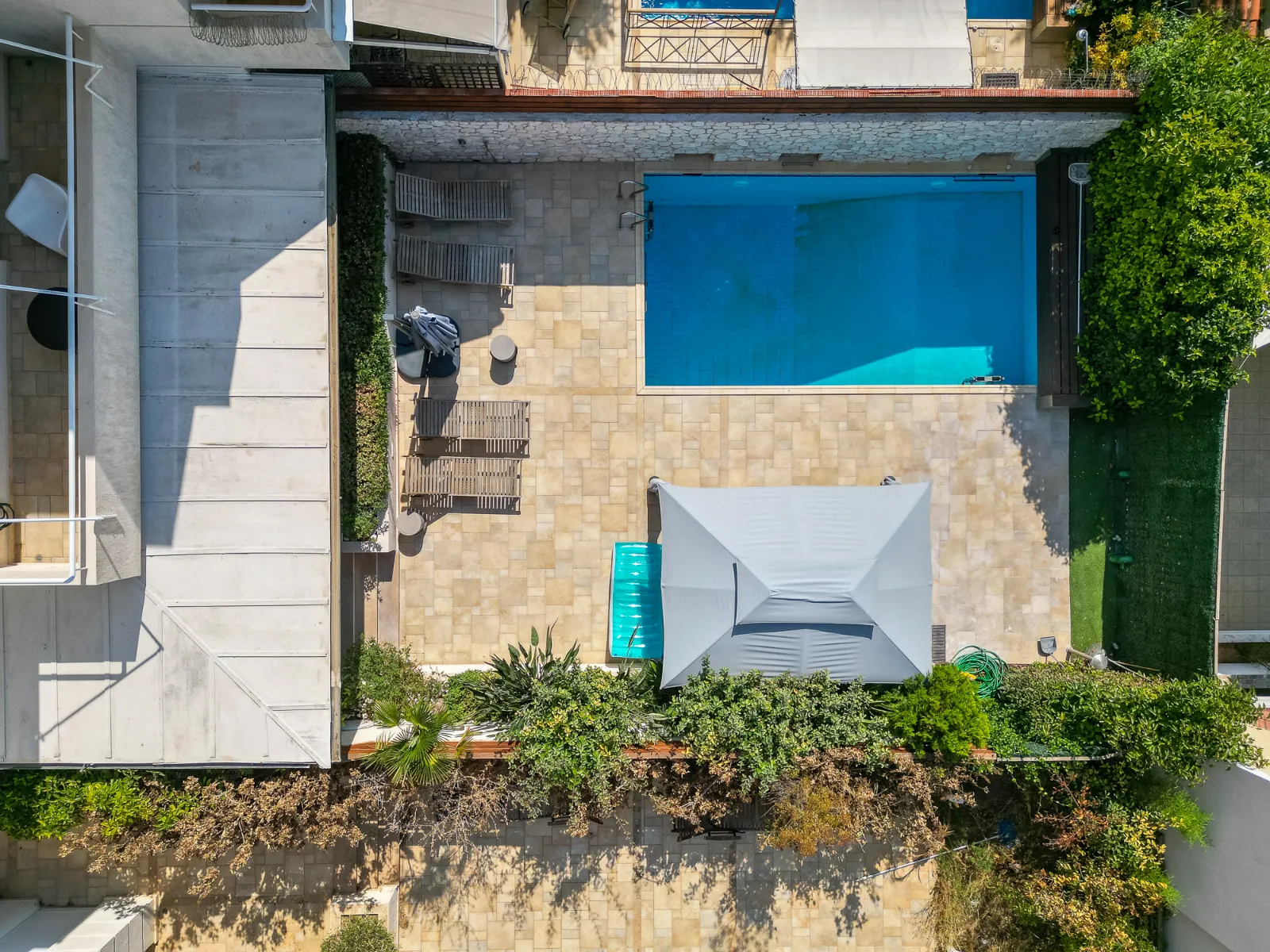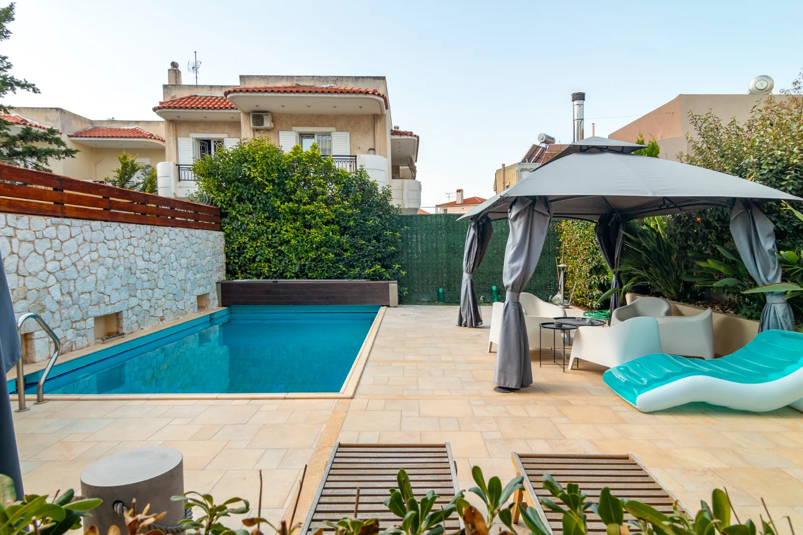 Detached house with a pool, garden, and 2 covered parking spaces. Covers 350 sq.m. on a 400 sq.m. plot, spread across 4 levels. Includes 2 kitchens, 1 living room, 3 bathrooms, and 2 WCs. Available furnished or unfurnished. Autonomous heating, energy class C (100%-141%). Year of construction: 2004.
