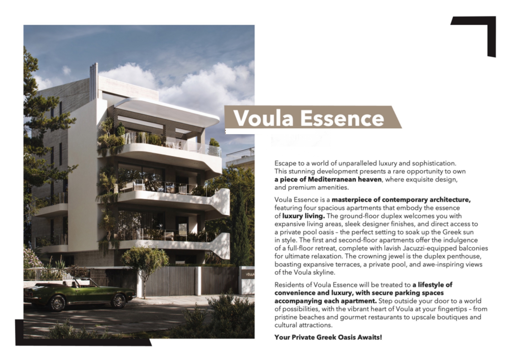 Located in the charming seaside haven of Voula, just 16 km from Athens' city center, Voula Essence offers the perfect blend of coastal charm, urban convenience, and cosmopolitan sophistication. These stunning residences aren't just a place to call home; they're private oases of luxury, meticulously crafted to provide the ultimate in comfort, elegance, and beauty.