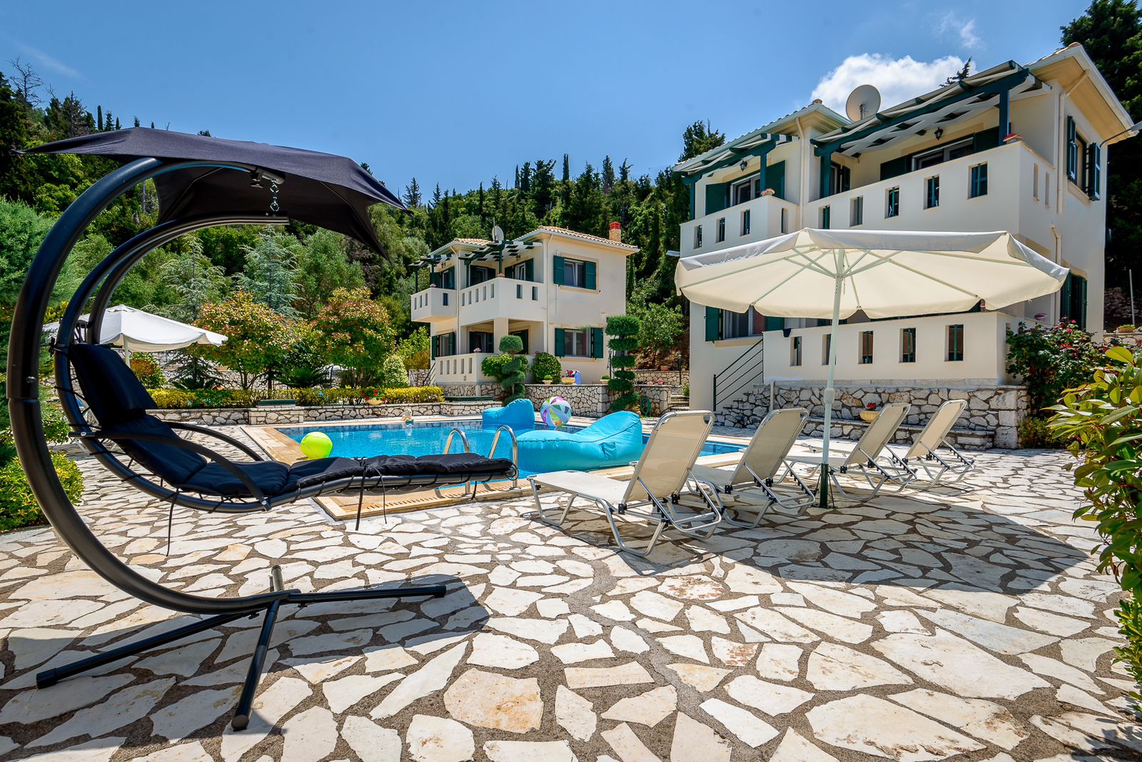 The wonderful landscaped outdoor space with stone consists of two independent swimming-pools with lounge areas, 2 BBQs, a wood-oven, a parking area, an underground water tank and an exterior storage room.