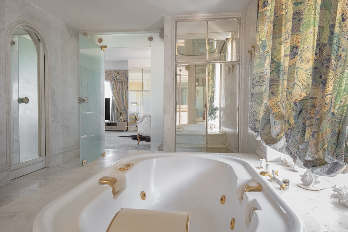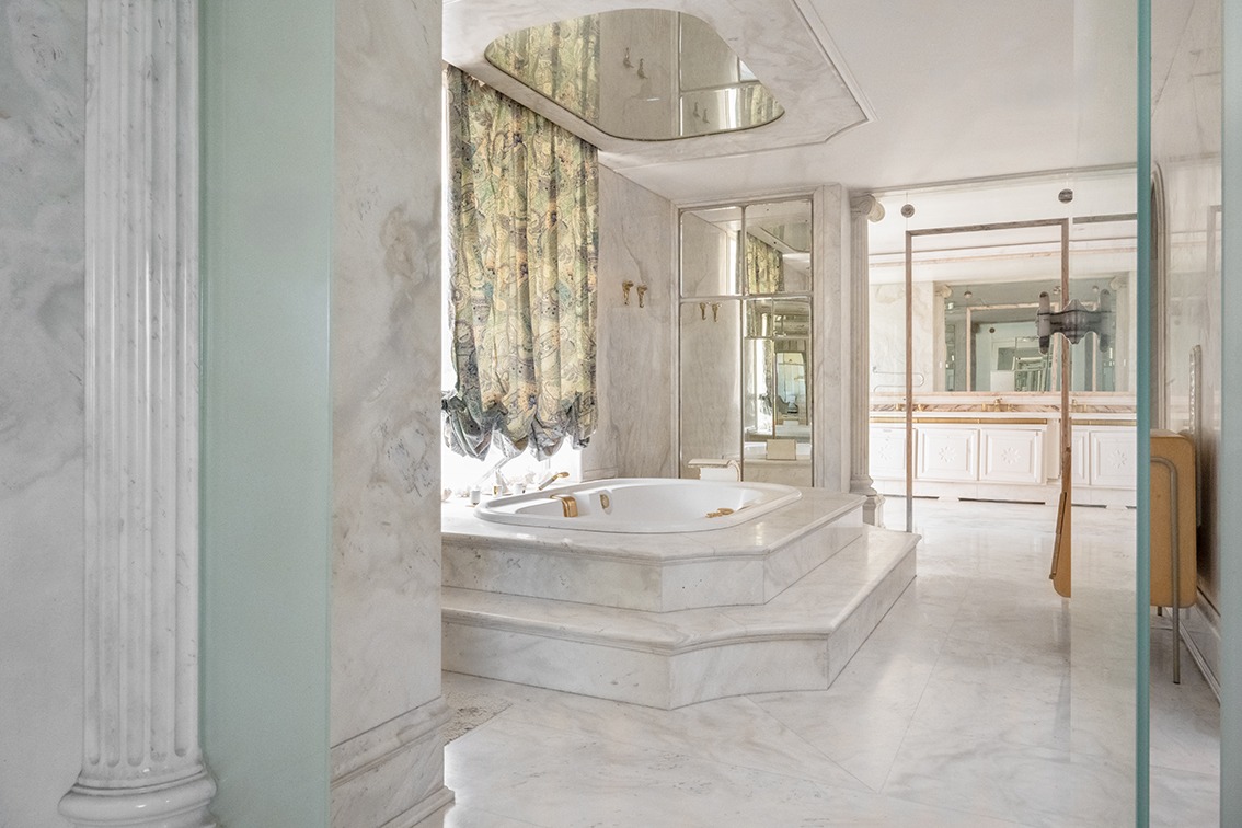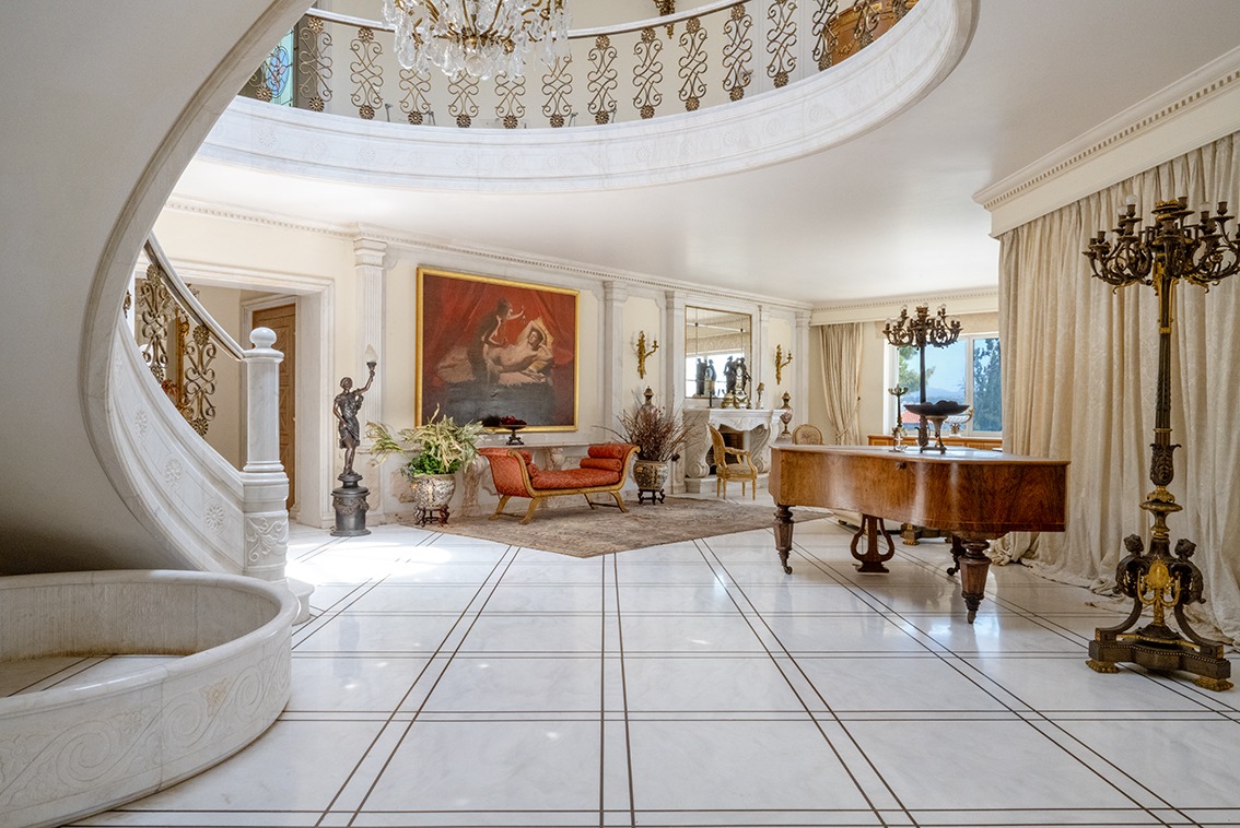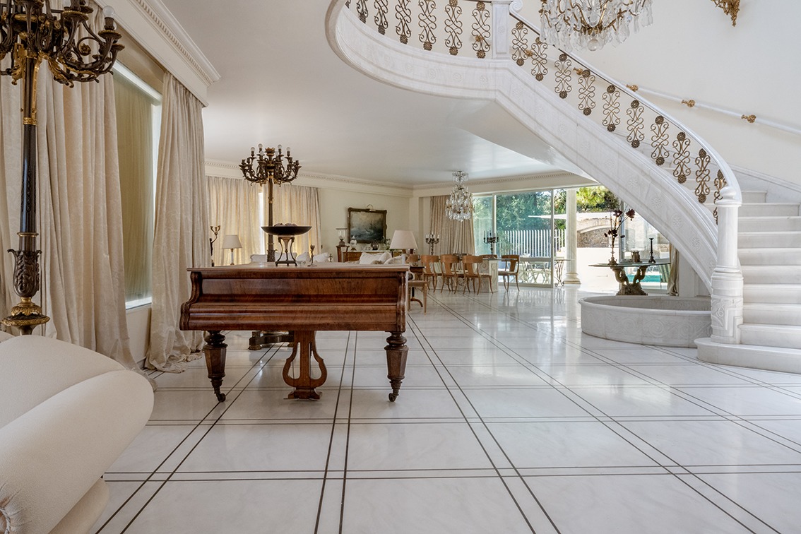 A marble master bathroom with jacuzzi, luxurious guest suites, a private study, a music room with piano, and expansive entertaining salons compose a setting of aristocratic refinement and comfort.