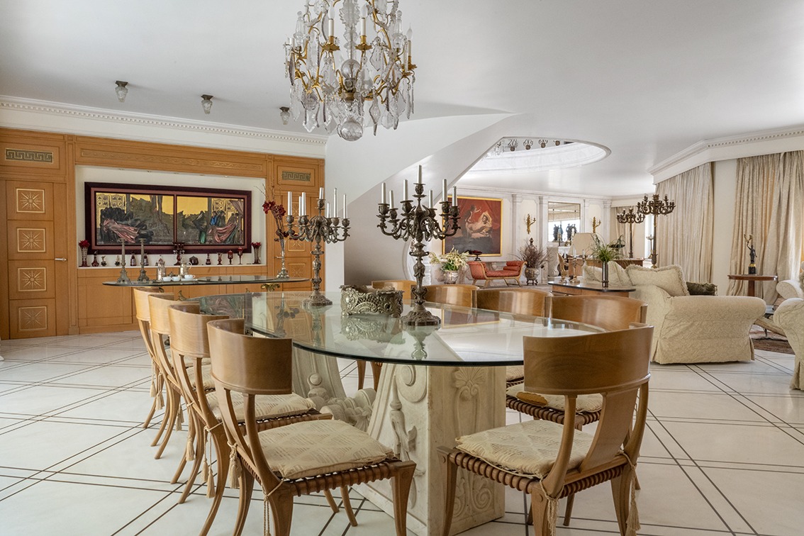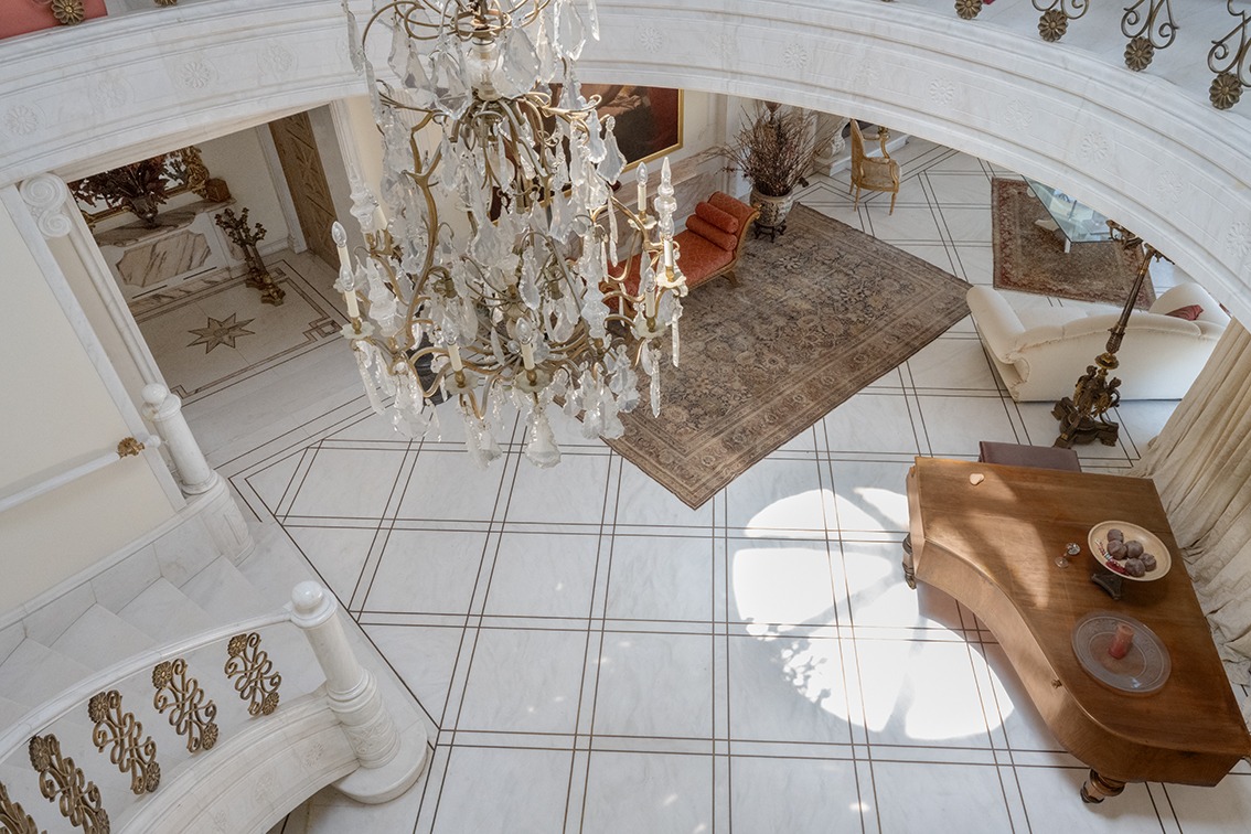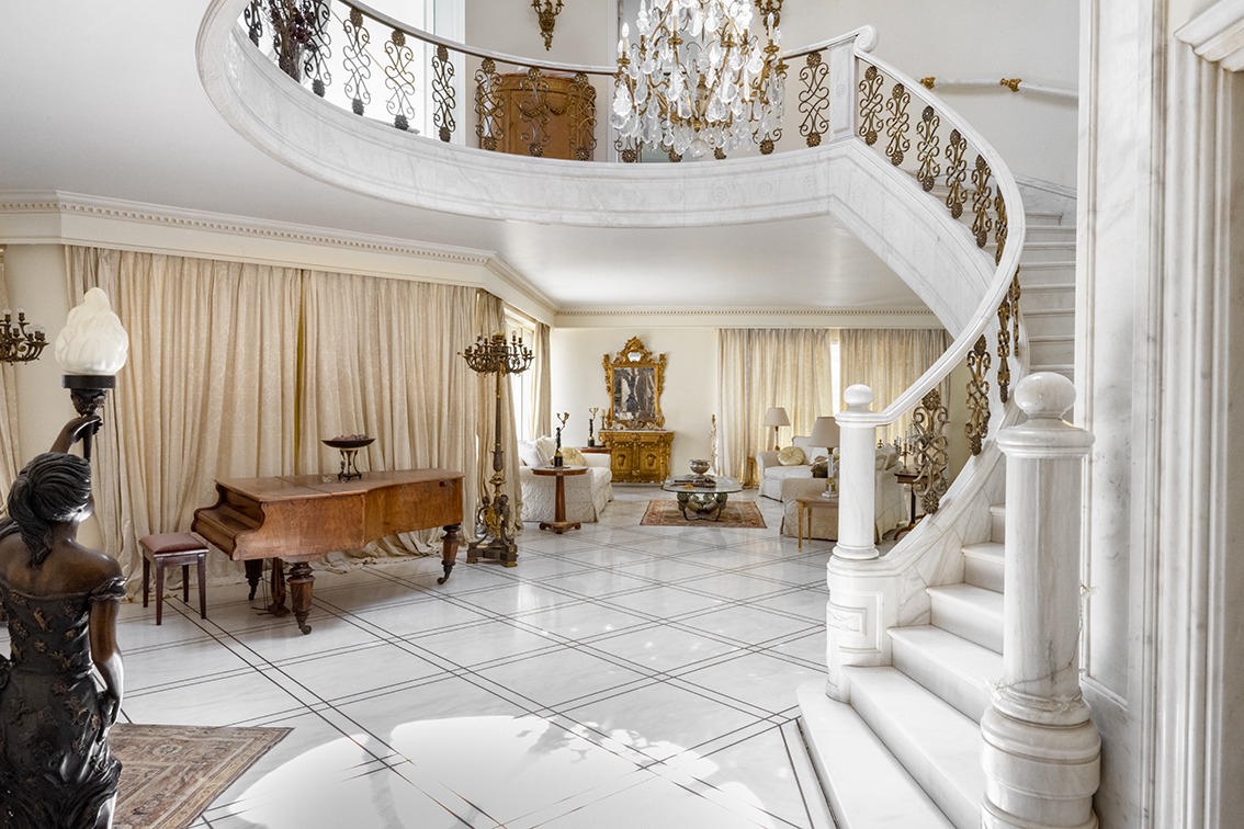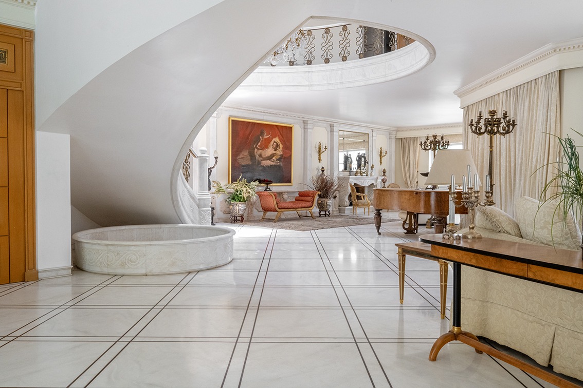 A grand double-height foyer with a majestic chandelier and circular marble staircase anchors the reception sequence. Lofty living rooms feature broad glazing with panoramic city vistas; floors, fireplaces, and details are hand-carved marble.