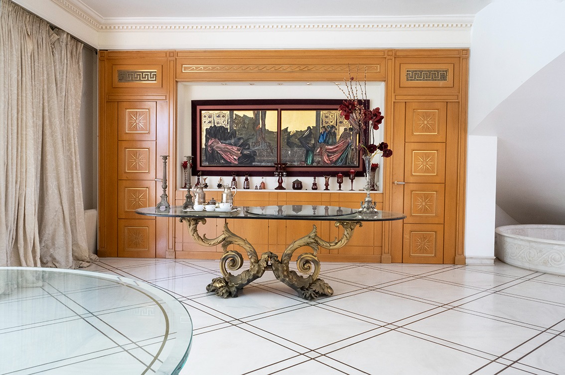 The décor blends antiques and certified artworks, including an authentic Napoleon-era buffet (one of only ten worldwide), ivory objets d’art of high artistic merit, and paintings with official certificates of authenticity.