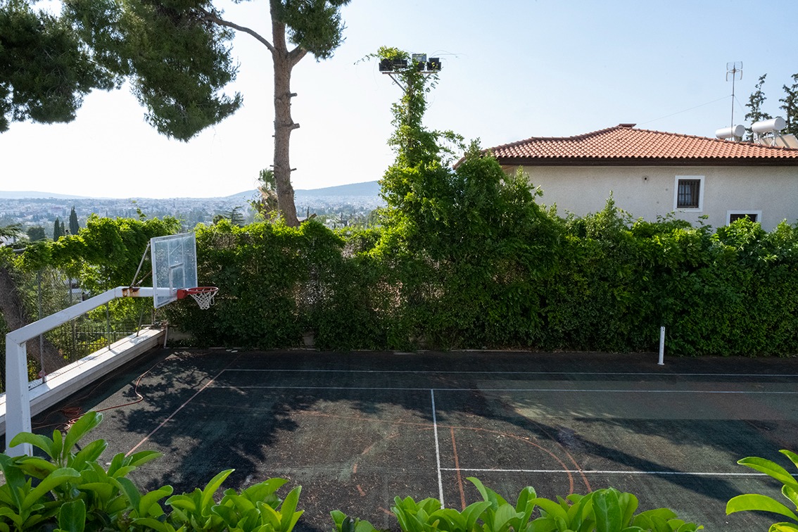 Filothei’s building coefficient is 0.40. The owner acquired the two adjacent one-acre plots under separate deeds and erected the entire 1,000 sq.m. on a single plot, leaving the second as an independent plot with a tennis court.