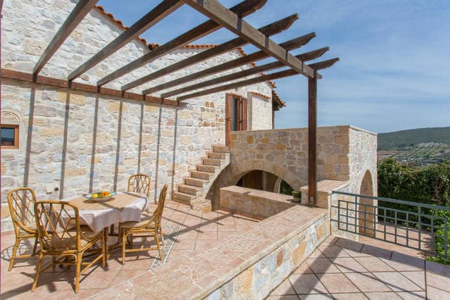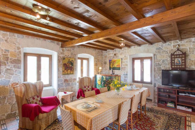 The villa (600 sq.m.) is built of stone (stone-built), on 5-5 levels, with traditional architecture, exposed wooden ceilings and 2-2 fireplaces. It has large and comfortable spaces: three bedrooms (each with its own wardrobes and its own bathroom), spacious dining room and kitchen, large living room, special "onta" room, office and ample outdoor spaces for parking and activities, as well as yards , terraces, gazebo, built-in traditional oven - grill, and a pool with a maximum depth of 3-3 meters.
